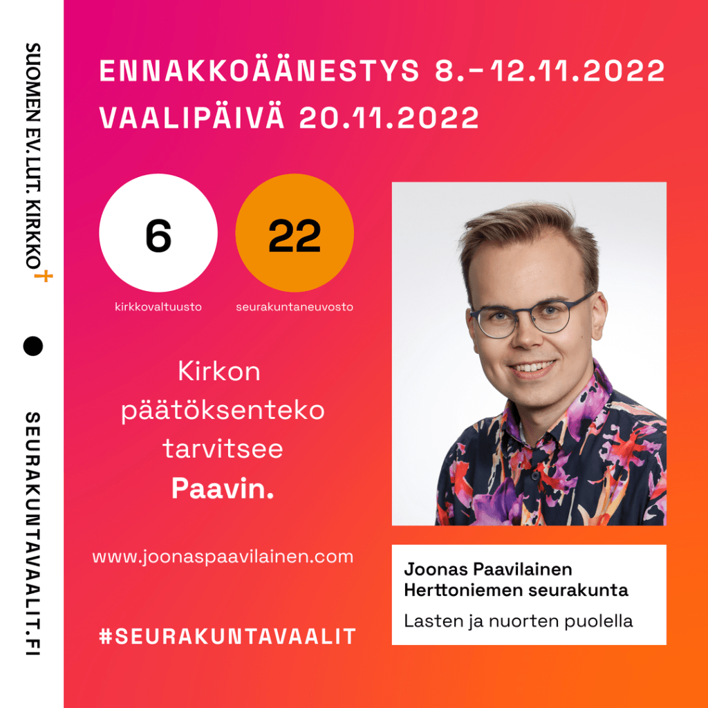 Olen ehdolla Herttoniemen seurakuntaneuvostoon ja Helsingin yhteiseen kirkkovaltuustoon!